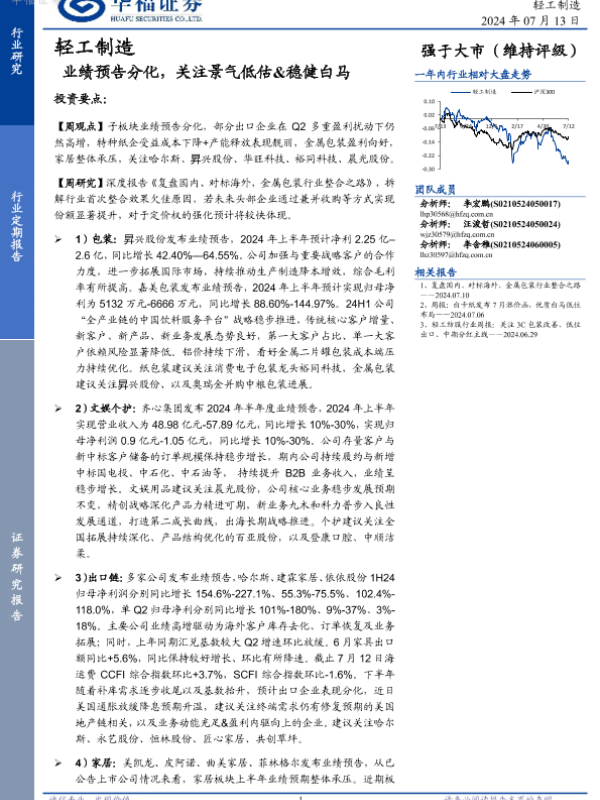 【华福证券】【20240713】20240713-华福证券-轻工制造行业定期报告:业绩预告分化,关注景气低估&稳健白马-21页