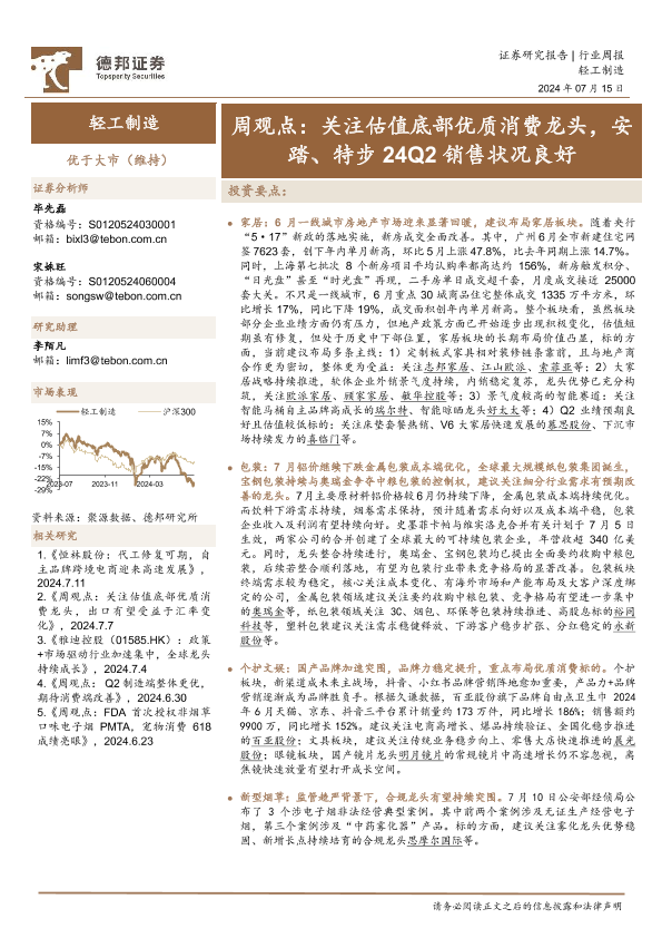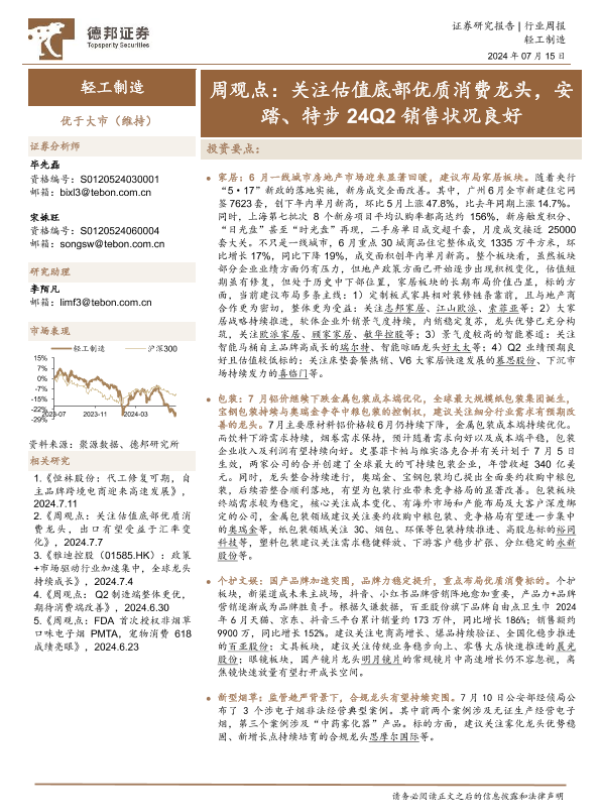 【德邦证券】【20240715】20240715-德邦证券-轻工制造周观点:关注估值底部优质消费龙头,安踏、特步24Q2销售状况良好-14页