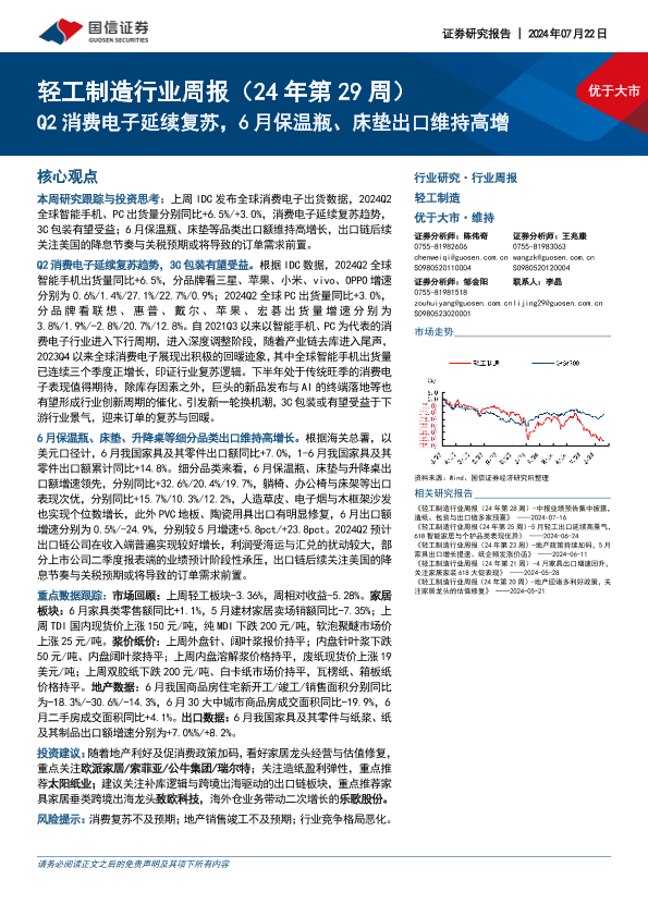 【国信证券】【20240722】20240722-国信证券-轻工制造行业周报(24年第29周):Q2消费电子延续复苏,6月保温瓶、床垫出口维持高增-18页