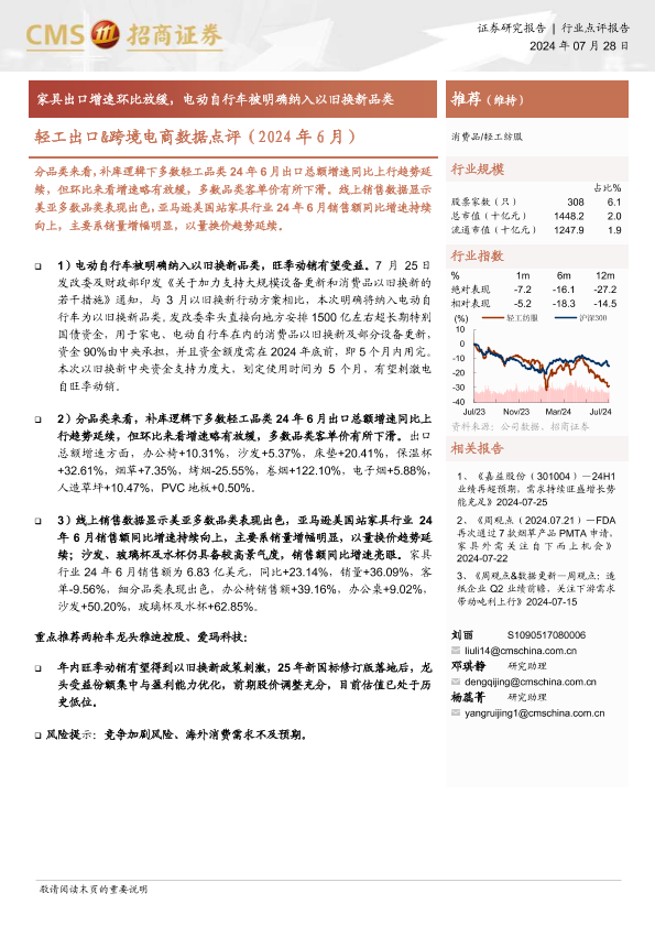 【海通证券】【20240728】轻工出口&跨境电商数据点评(2024年6月):家具出口增速环比放缓,电动自行车被明确纳入以旧换新品类-10页