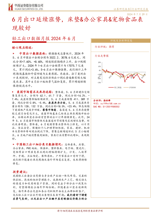 【华西证券】【20240729】2024年6月轻工出口数据月报:6月出口延续涨势,床垫&办公家具&宠物食品表现较好-13页