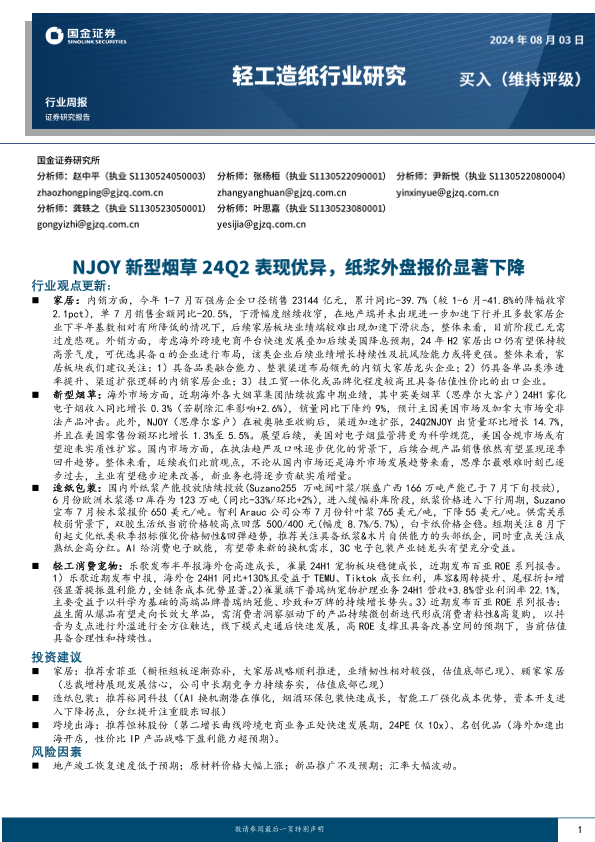 【国金证券】【20240803】20240803-国金证券-轻工造纸行业周报:NJOY新型烟草24Q2表现优异,纸浆外盘报价显著下降-16页