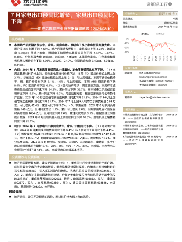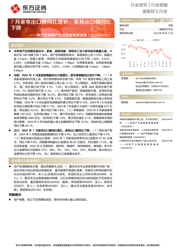 【东方证券】【20240811】20240811-东方证券-造纸轻工行业行业周报:地产后周期产业链数据每周速递-7月家电出口额同比增长,家具出口额同比下降-14页
