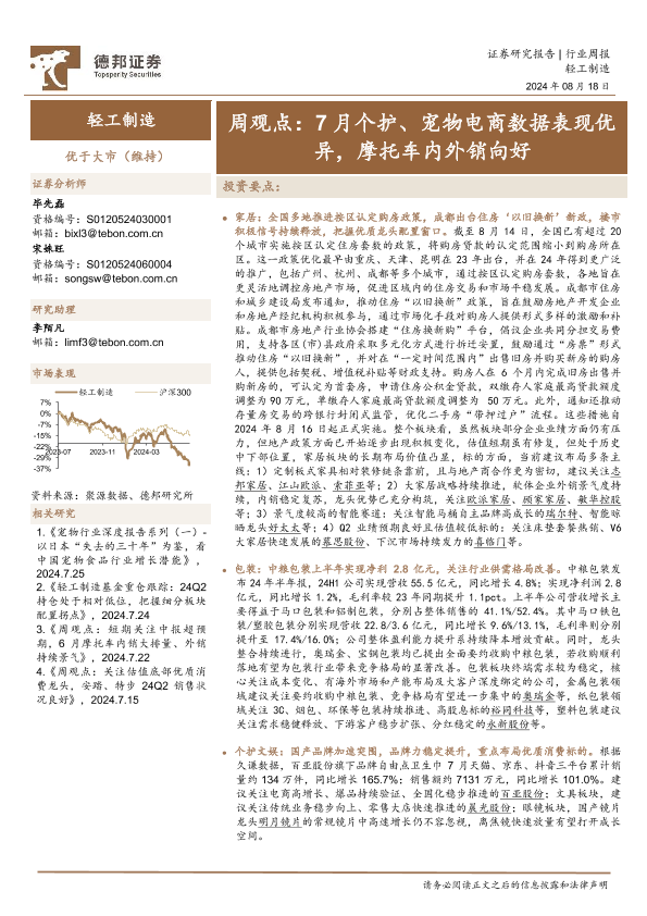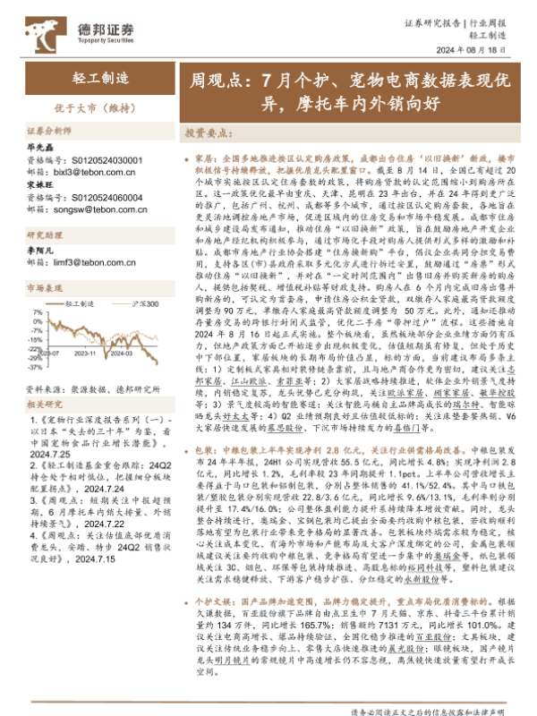 【德邦证券】【20240818】20240818-德邦证券-轻工制造周观点:7月个护、宠物电商数据表现优异,摩托车内外销向好-14页
