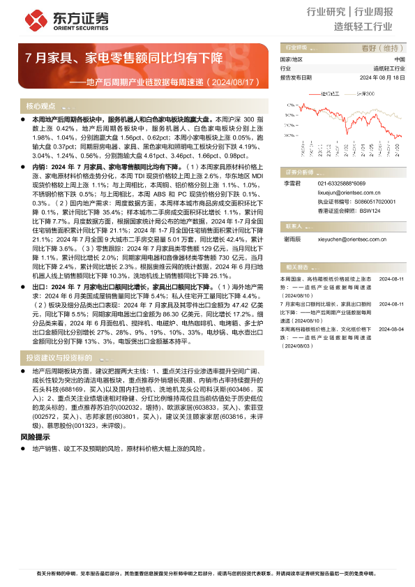 【东方证券】【20240818】20240818-东方证券-造纸轻工行业地产后周期产业链数据每周速递:7月家具、家电零售额同比均有下降-14页