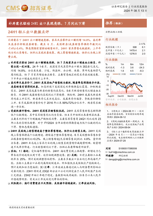 【海通证券】【20240813】24H1轻工出口数据点评:补库需求驱动24H1出口表现亮眼,7月同比下滑-16页
