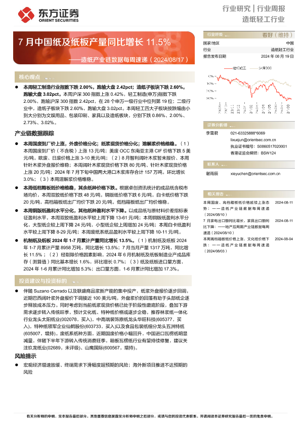 【东方证券】【20240819】20240819-东方证券-造纸产业链数据每周速递:7月中国纸及纸板产量同比增长11.5%-12页