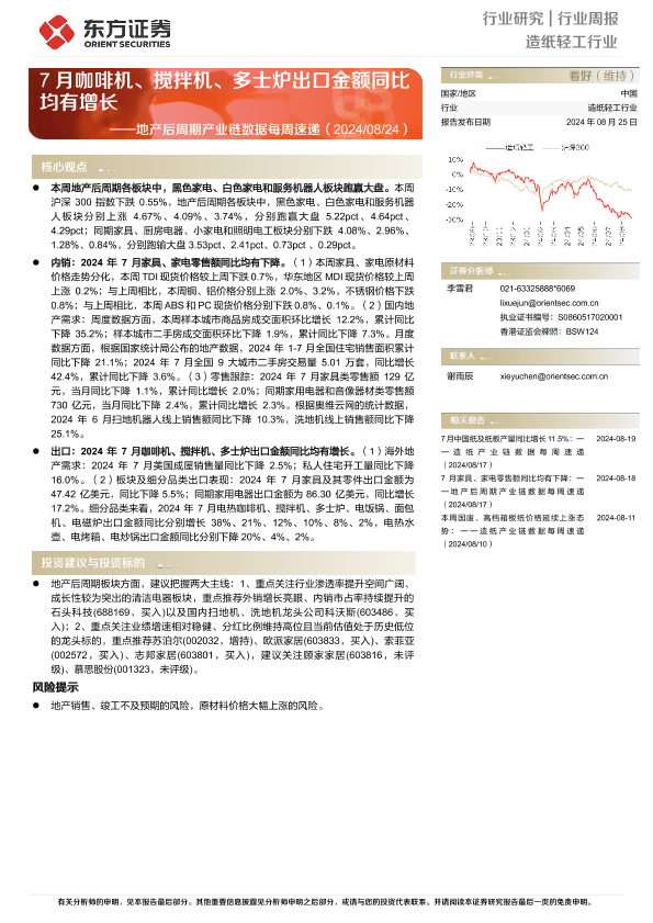 【东方证券】【20240825】20240825-东方证券-造纸轻工行业:地产后周期产业链数据每周速递-7月咖啡机、搅拌机、多士炉出口金额同比均有增长-15页