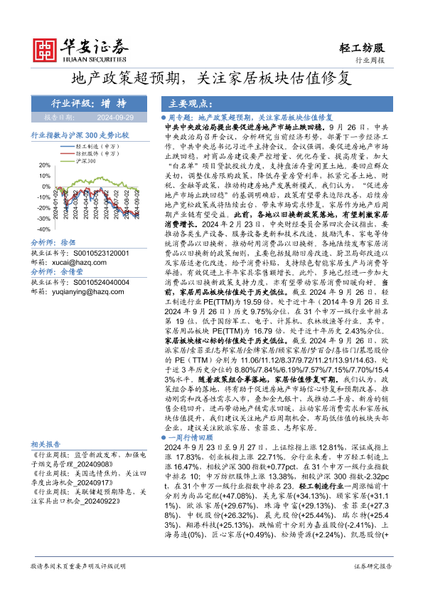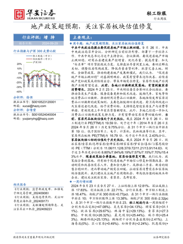 【华安证券】【20240929】20240929-华安证券-轻工纺服行业周报:地产政策超预期,关注家居板块估值修复-24页