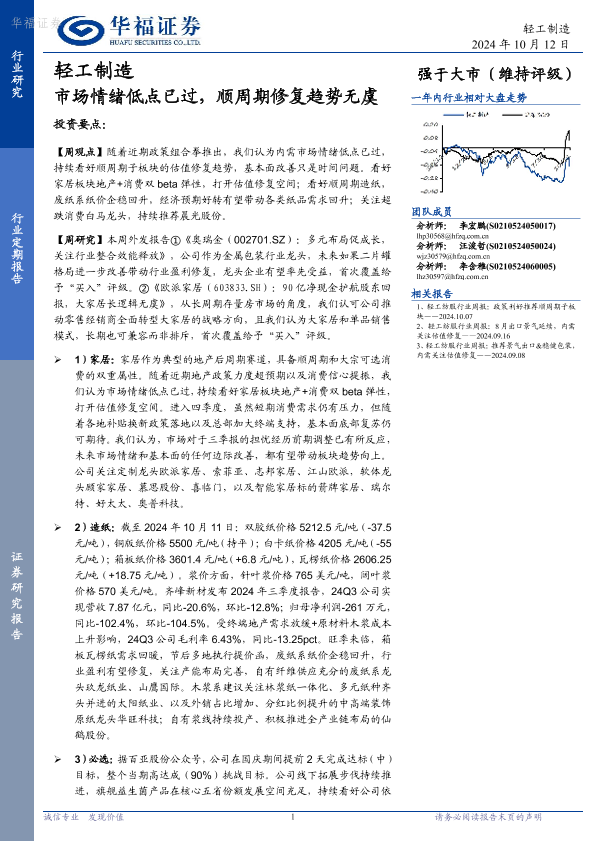 【华福证券】【20241012】轻工制造:市场情绪低点已过,顺周期修复趋势无虞-21页