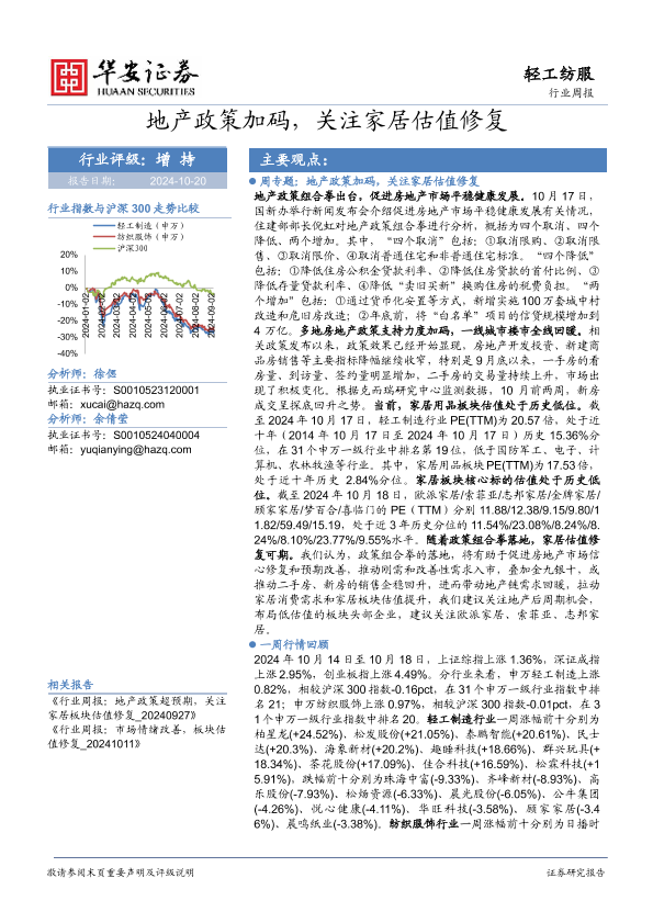 【华安证券】【20241020】轻工纺服行业周报:地产政策加码,关注家居估值修复-23页