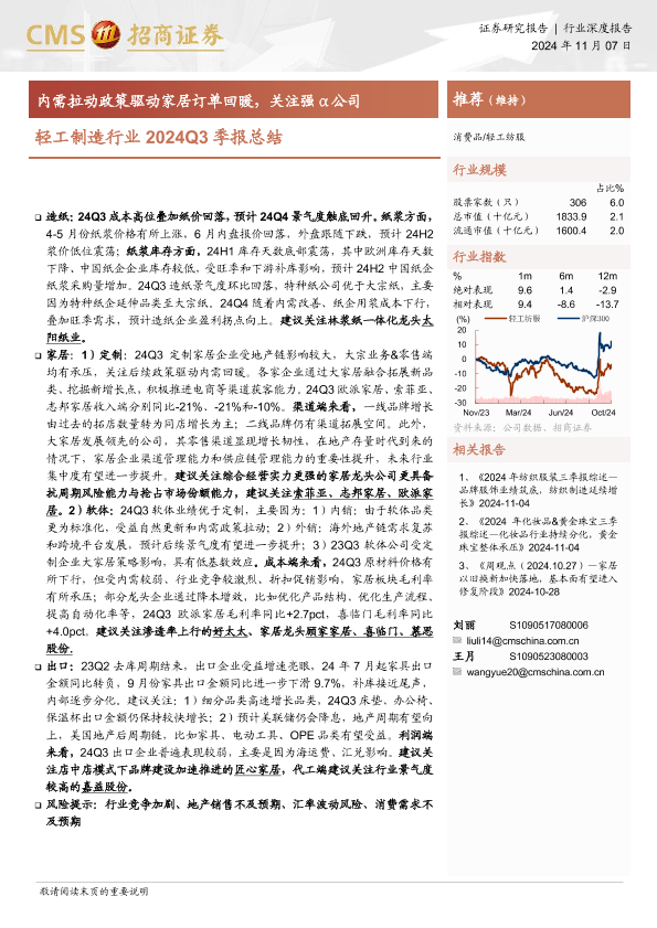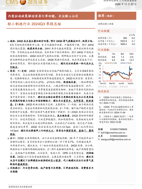 【海通证券】【20241107】轻工制造行业2024Q3季报总结:内需拉动政策驱动家居订单回暖,关注强α公司-14页