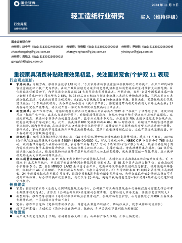 【国金证券】【20241109】20241109-国金证券-轻工造纸行业周报:重视家具消费补贴政策效果初显,关注国货宠食个护双11表现-15页