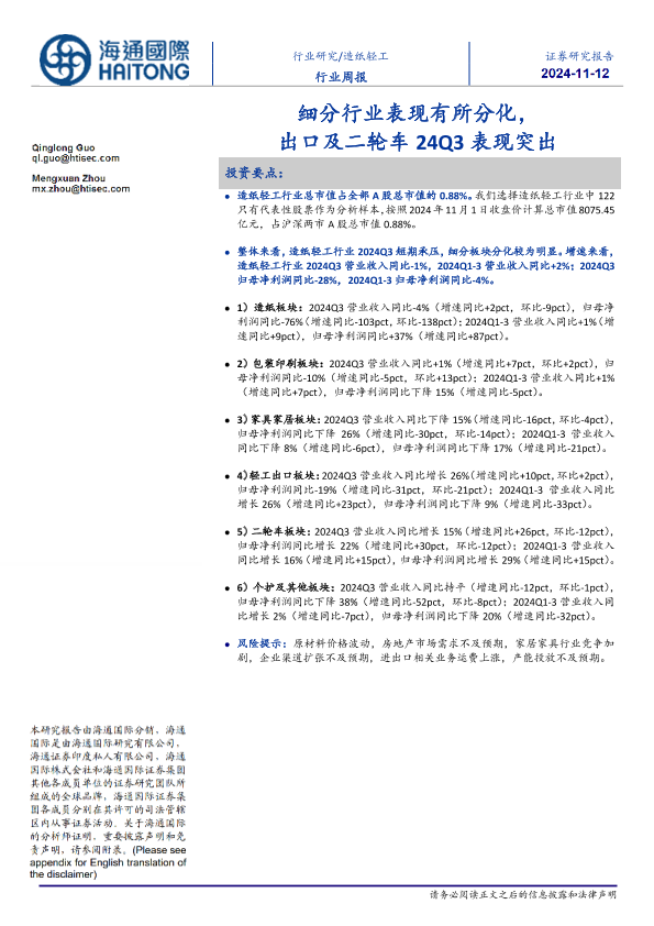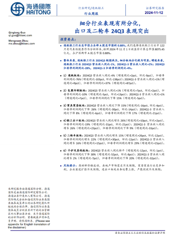 【海通国际】【20241112】20241112-海通国际-造纸轻工行业周报:细分行业表现有所分化,出口及二轮车24Q3表现突出-21页