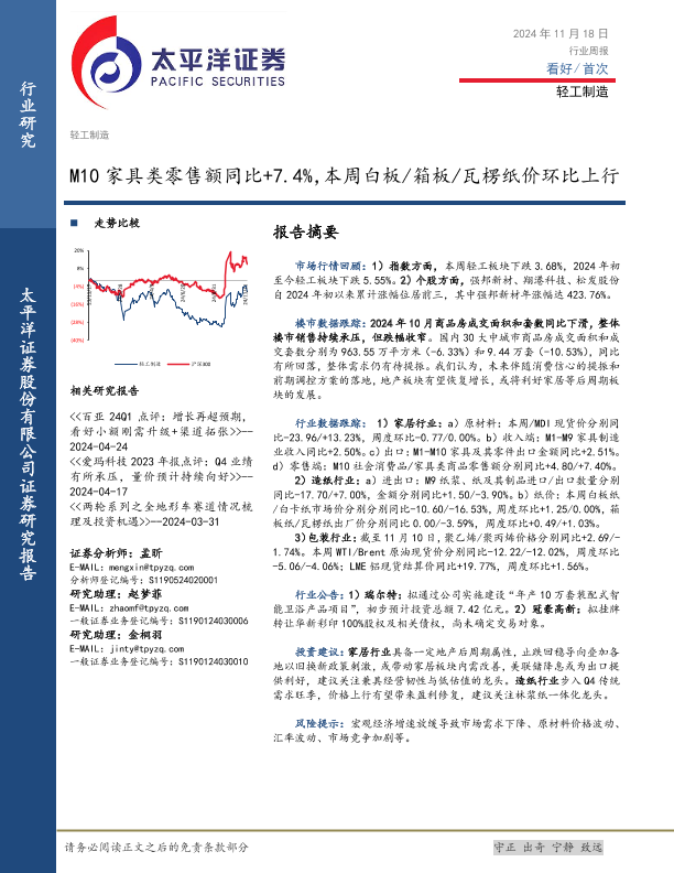【太平洋证券】【20241118】20241118-太平洋-轻工制造行业周报:M10家具类零售额同比+7.4%,本周白板 箱板 瓦楞纸价环比上行-14页