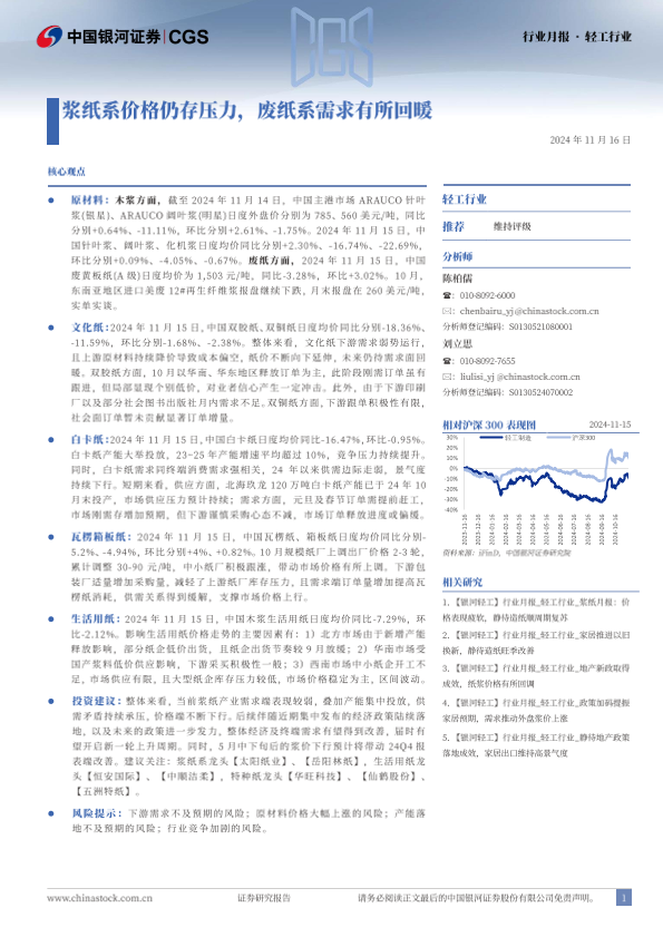 【银河证券】【20241116】20241116-中国银河-轻工行业行业月报:浆纸系价格仍存压力,废纸系需求有所回暖-22页