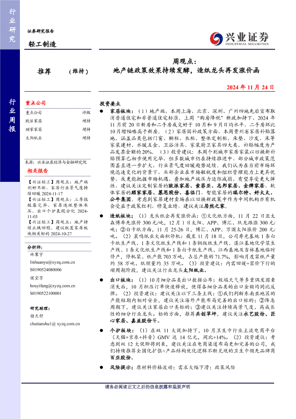 【兴业证券】【20241124】20241124-兴业证券-轻工制造行业周观点:地产链政策效果持续发酵,造纸龙头再发涨价函-14页