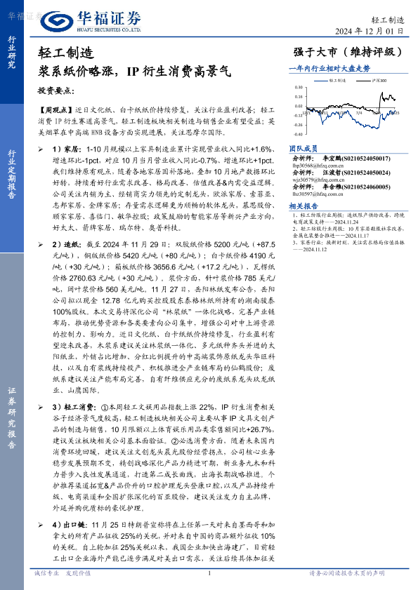 【华福证券】【20241201】20241201-华福证券-轻工制造行业定期报告:浆系纸价略涨,IP衍生消费高景气-20页