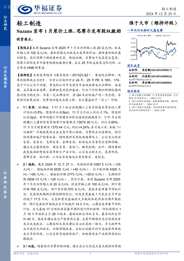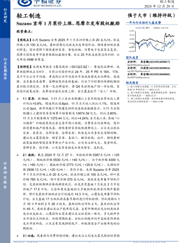 【华福证券】【20241229】轻工制造:Suzano宣布1月浆价上涨,思摩尔发布股权激励-21页