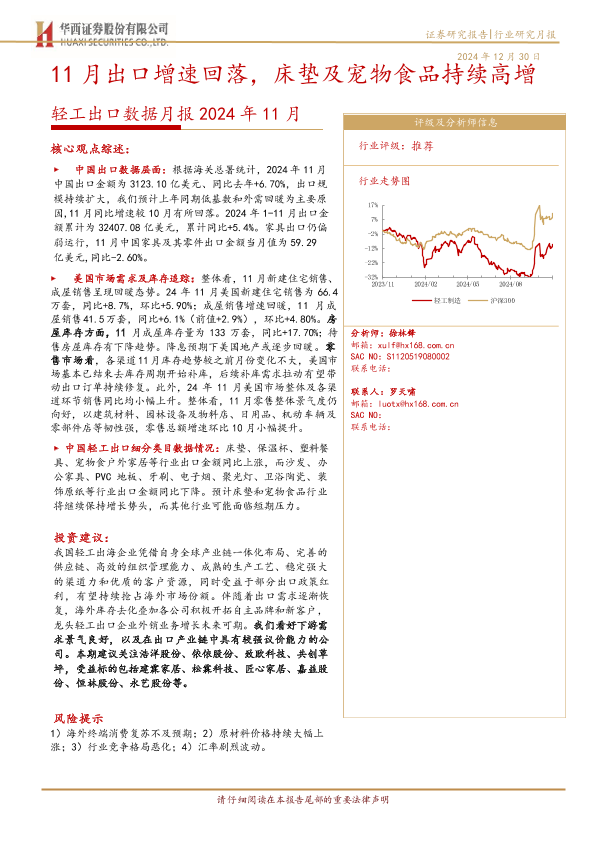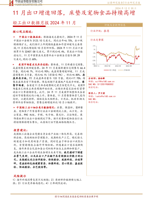 【华西证券】【20241230】2024年11月轻工出口数据月报:11月出口增速回落,床垫及宠物食品持续高增-12页