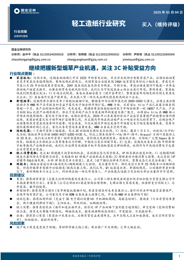 【国金证券】【20250104】20250104-国金证券-轻工造纸行业周报:继续把握新型烟草产业机遇,关注3C补贴受益方向-16页