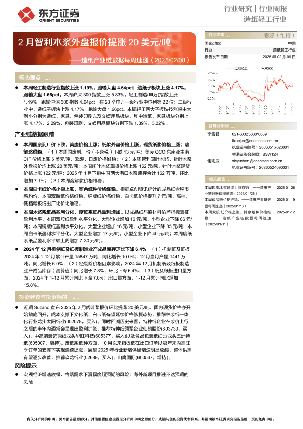 【东方证券】【20250209】20250209-东方证券-造纸轻工行业造纸产业链数据每周速递:2月智利木浆外盘报价提涨20美元 吨-12页