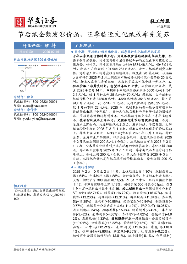 【华安证券】【20250216】20250216-华安证券-轻工纺服行业周报:节后纸企频发涨价函,旺季临近文化纸或率先复苏-21页