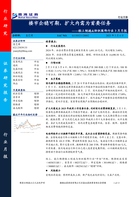 【渤海证券】【20250306】轻工制造&纺织服饰行业3月月报:楼市企稳可期,扩大内需为首要任务-13页