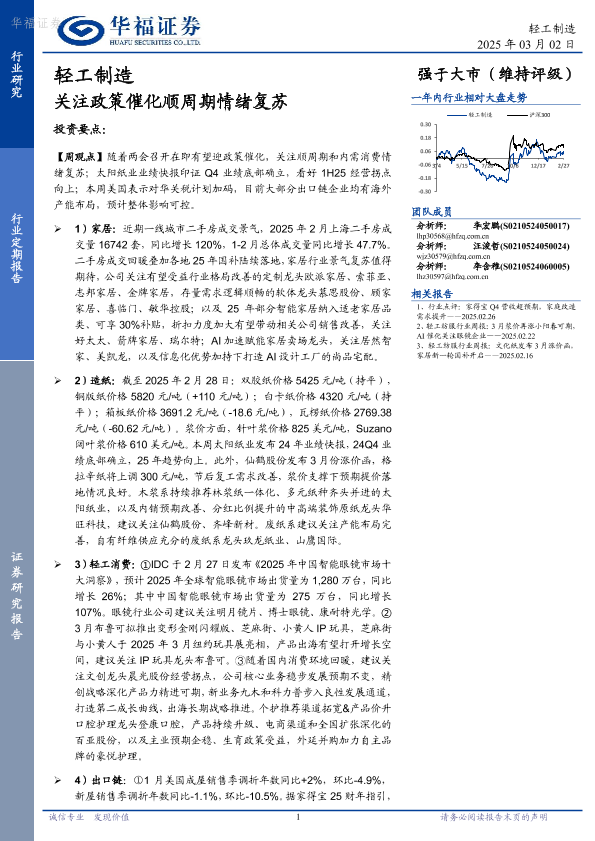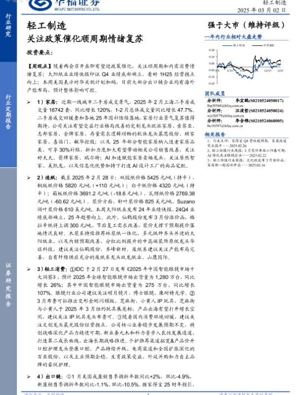 【华福证券】【20250302】20250302-华福证券-轻工制造行业定期报告:关注政策催化顺周期情绪复苏-20页