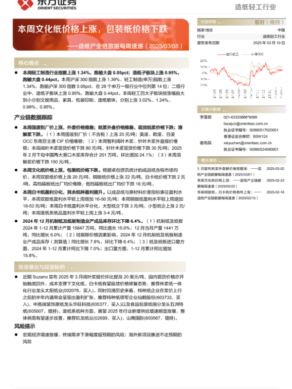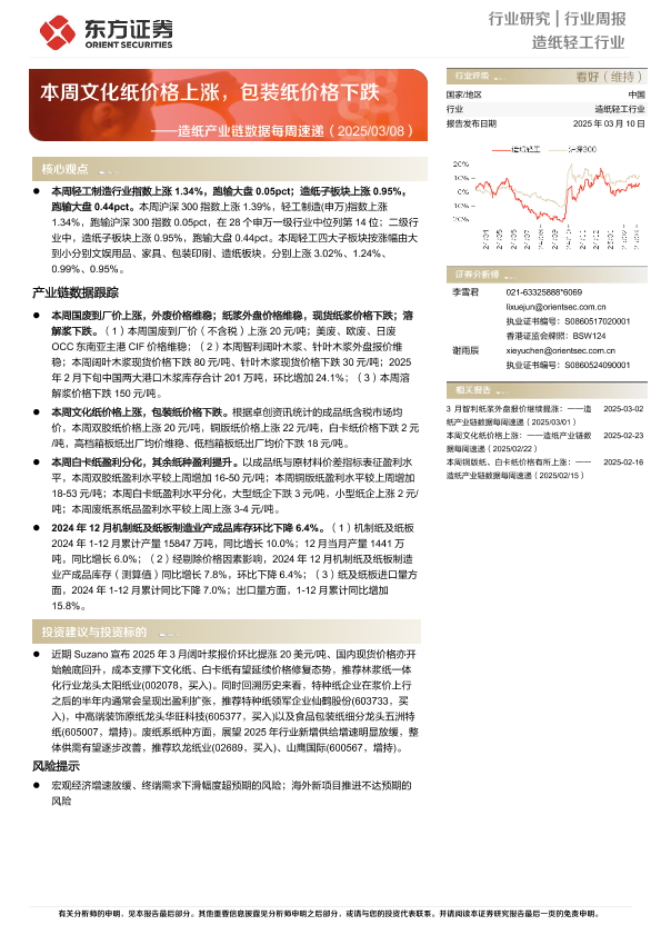 【东方证券】【20250310】20250310-东方证券-造纸轻工行业造纸产业链数据每周速递:本周文化纸价格上涨,包装纸价格下跌-12页