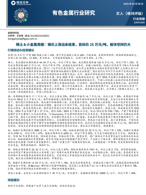 【国金证券】【20250308】20250308-国金证券-有色金属行业稀土&小金属周报:锑价上涨远未结束,目标价25万元 吨,板块空间仍大-14页
