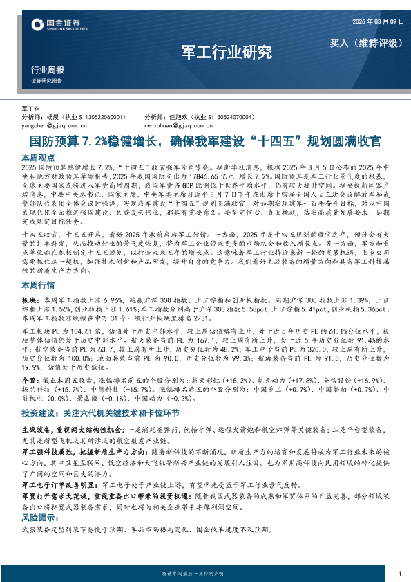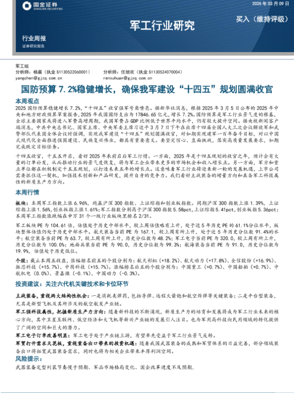 【国金证券】【20250309】20250309-国金证券-军工行业研究:国防预算7.2%稳健增长,确保我军建设“十四五”规划圆满收官-13页