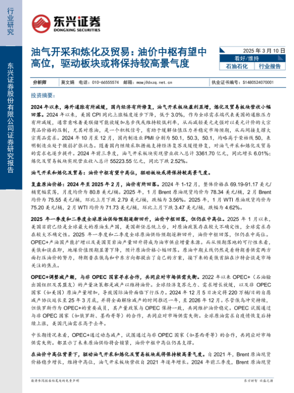 【东兴证券】【20250310】油气开采和炼化及贸易:油价中枢有望中高位,驱动板块或将保持较高景气度-13页