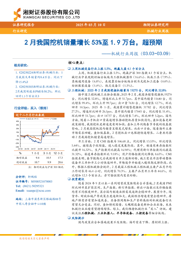 【湘财证券】【20250310】20250310-湘财证券-机械行业周报:2月我国挖机销量增长53%至1.9万台,超预期-15页