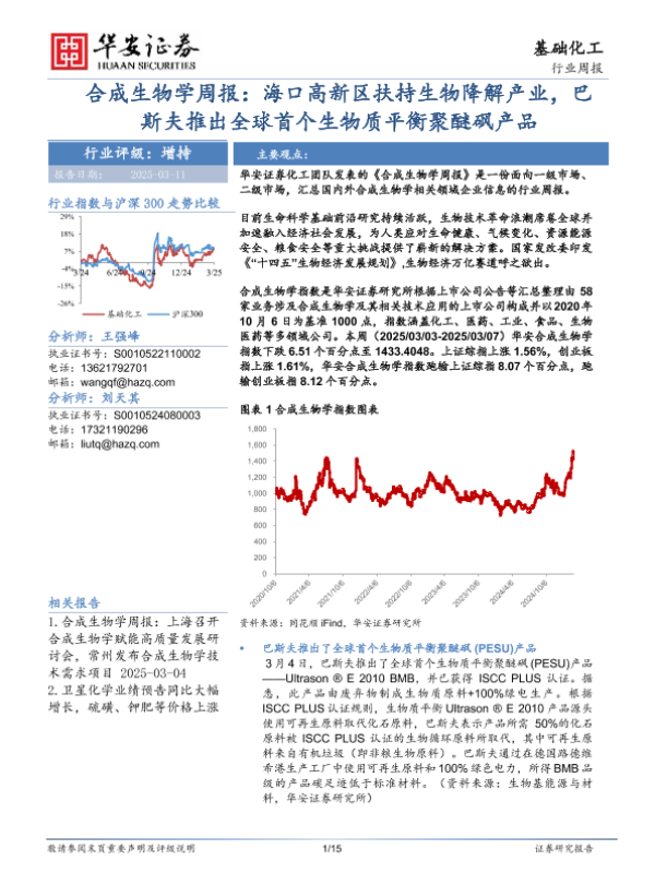 【华安证券】【20250311】20250311-华安证券-合成生物学周报:海口高新区扶持生物降解产业,巴斯夫推出全球首个生物质平衡聚醚砜产品-15页