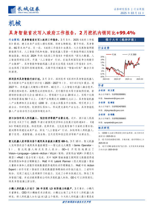 【长城证券】【20250311】机械行业周报:具身智能首次写入政府工作报告,2月挖机内销同比+99.4%-14页