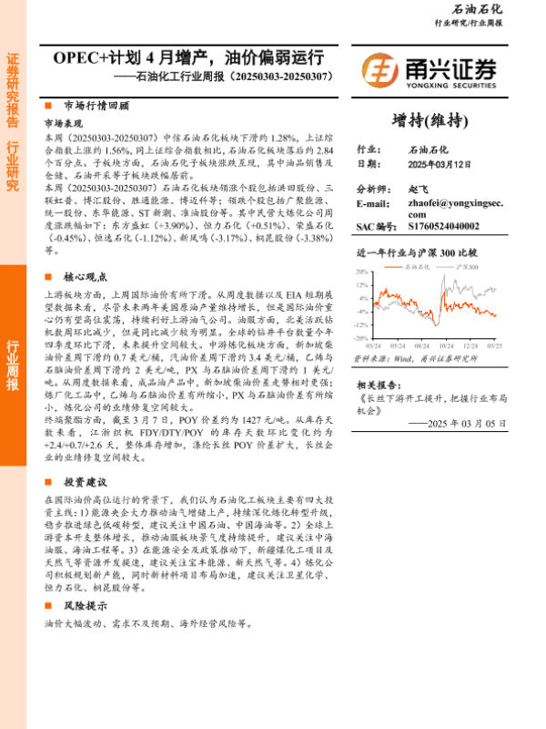 【甬兴证券】【20250312】20250312-甬兴证券-石油化工行业周报:OPEC+计划4月增产,油价偏弱运行-11页