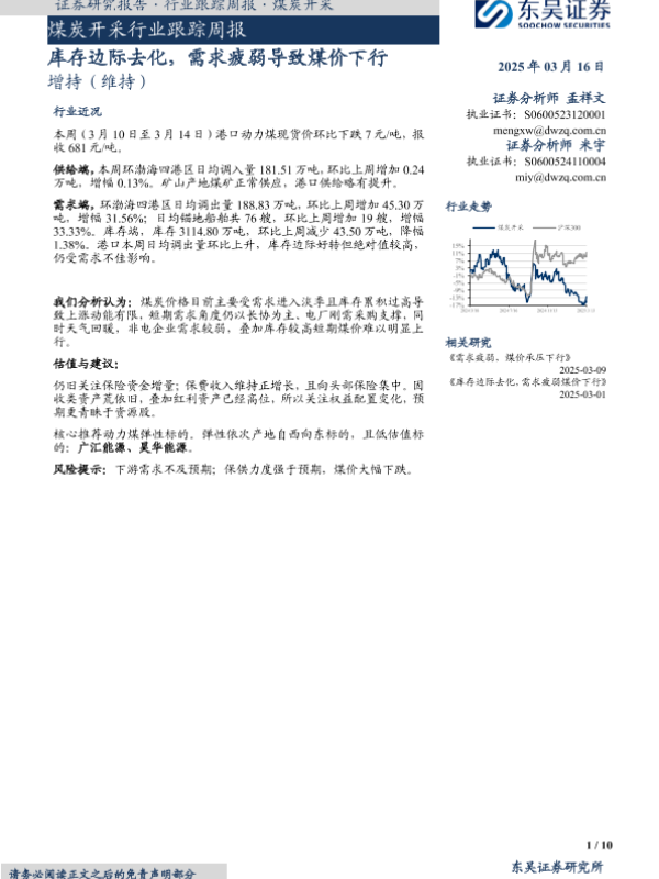 【东吴证券】【20250316】20250316-东吴证券-煤炭开采行业跟踪周报:库存边际去化,需求疲弱导致煤价下行-10页