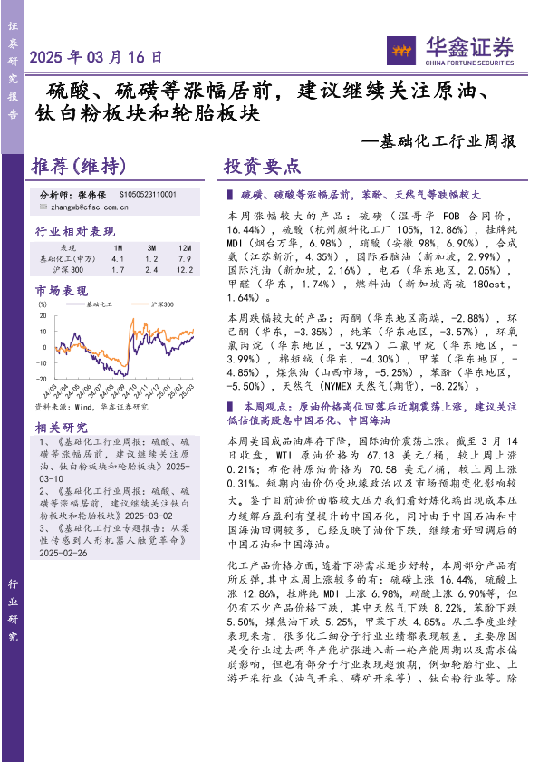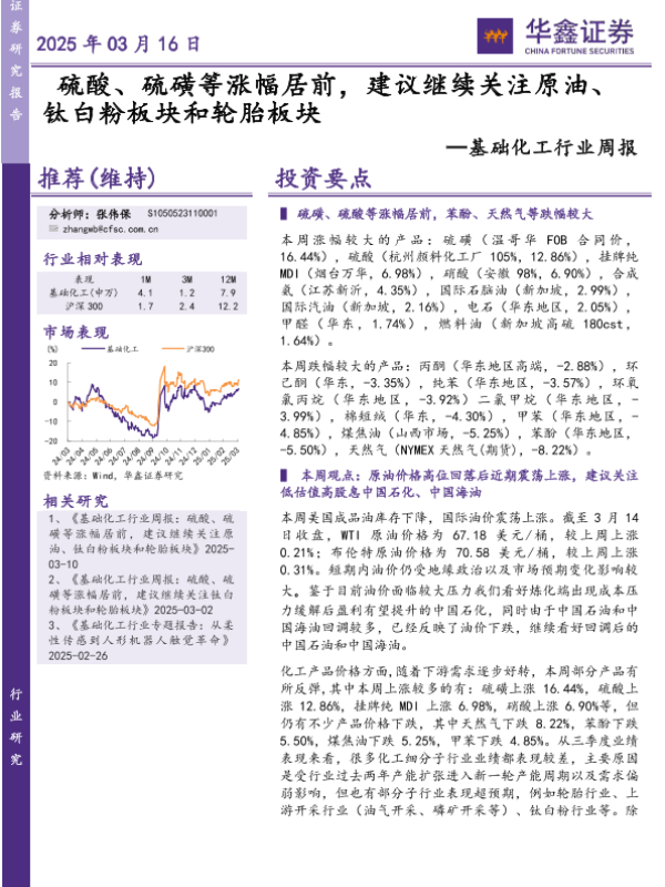 【华鑫证券】【20250316】20250316-华鑫证券-基础化工行业周报:硫酸、硫磺等涨幅居前,建议继续关注原油、钛白粉板块和轮胎板块-32页