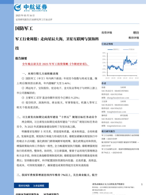 【中航证券】【20250316】军工行业周报 走向星辰大海,卫星互联网与深海科技-41页