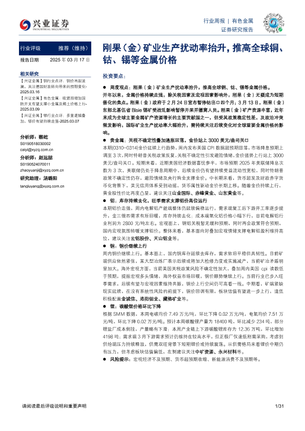 【兴业证券】【20250317】20250317-兴业证券-有色金属行业周报:刚果(金)矿业生产扰动率抬升,推高全球铜、钴、锡等金属价格-31页