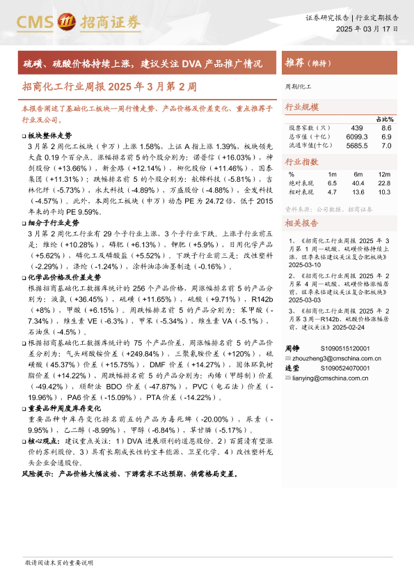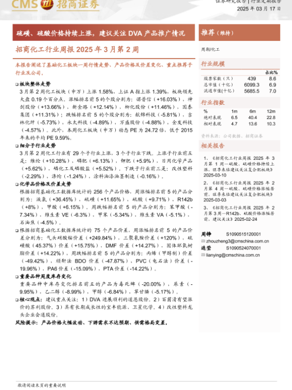 【海通证券】【20250317】招商化工行业周报2025年3月第2周:硫磺、硫酸价格持续上涨,建议关注DVA产品推广情况-15页