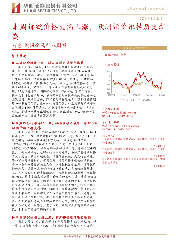 【华西证券】【20250322】20250322-华西证券-有色-能源金属行业周报:本周锑锭价格大幅上涨,欧洲锑价维持历史新高-20页