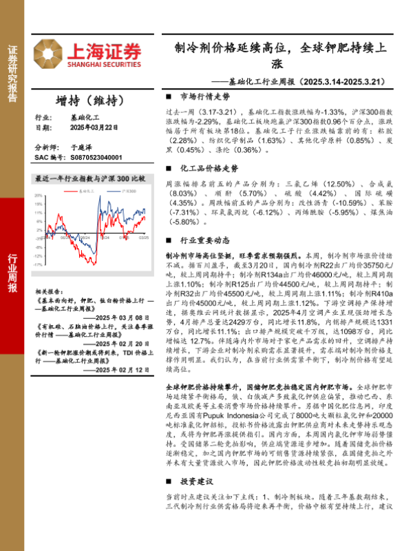 【上海证券】【20250322】基础化工行业周报:制冷剂价格延续高位,全球钾肥持续上涨-10页
