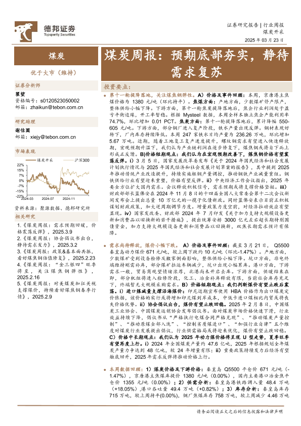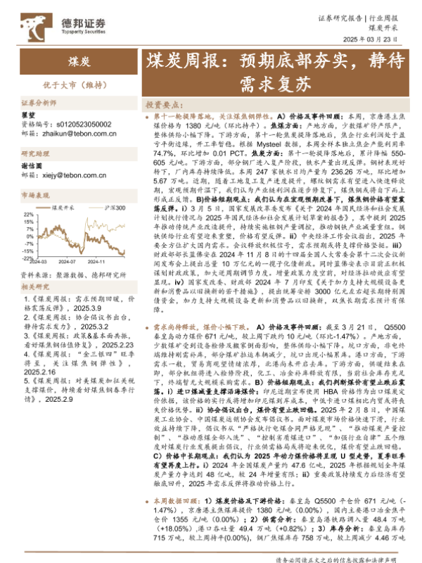 【德邦证券】【20250323】20250323-德邦证券-煤炭周报:预期底部夯实,静待需求复苏-16页