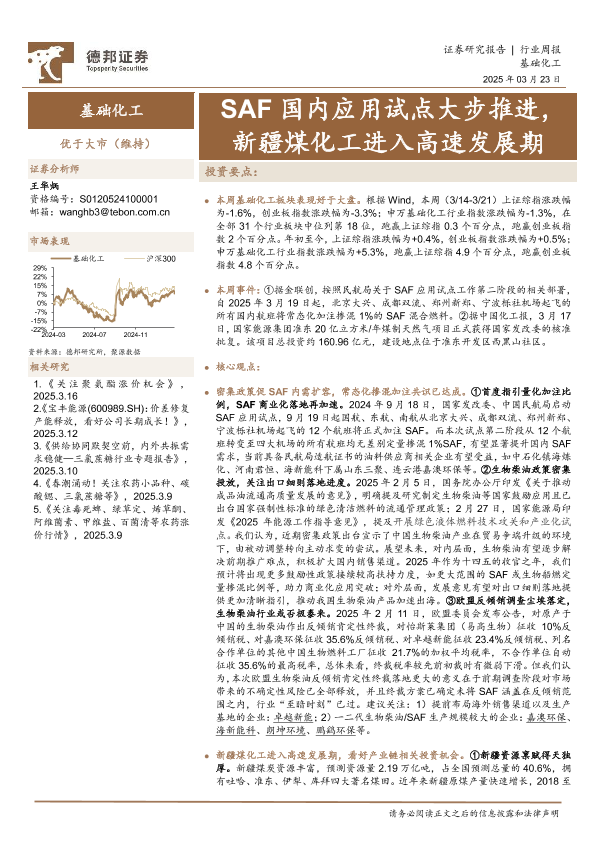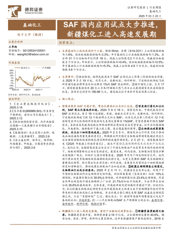 【德邦证券】【20250323】基础化工行业周报:SAF国内应用试点大步推进,新疆煤化工进入高速发展期-42页