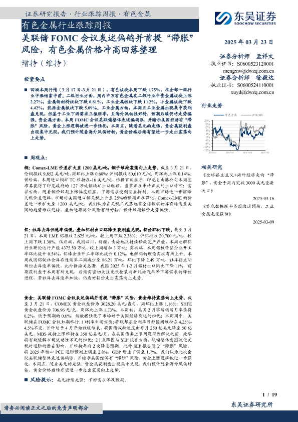 【东吴证券】【20250323】20250323-东吴证券-有色金属行业跟踪周报:美联储FOMC会议表述偏鸽并首提“滞胀”风险,有色金属价格冲高回落整理-19页