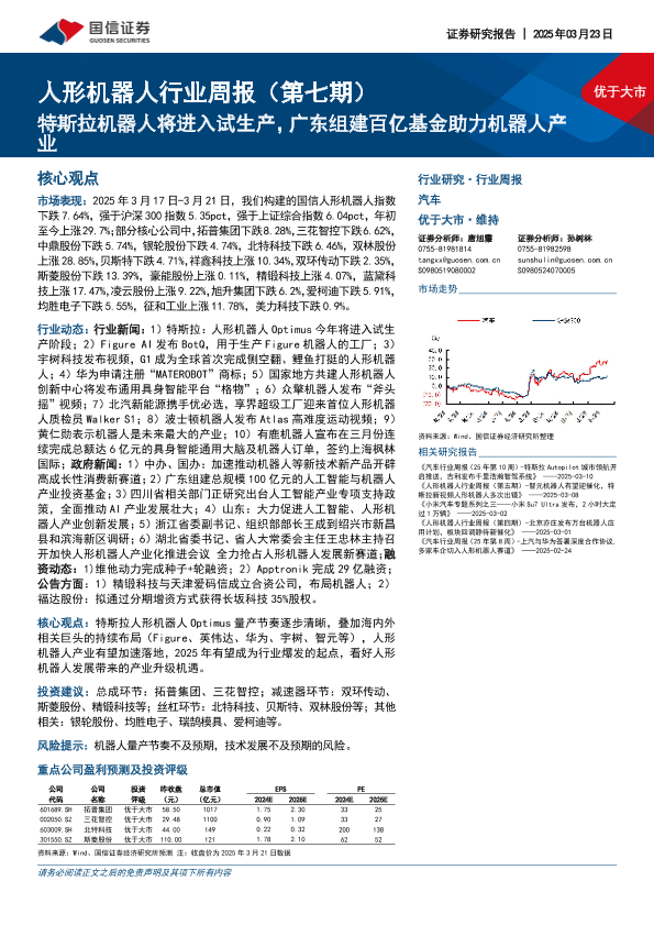 【国信证券】【20250323】20250323-国信证券-人形机器人行业周报(第七期):特斯拉机器人将进入试生产,广东组建百亿基金助力机器人产业-13页