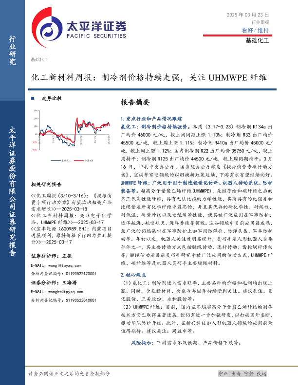 【太平洋证券】【20250323】20250323-太平洋-化工新材料周报:制冷剂价格持续走强,关注UHMWPE纤维-22页