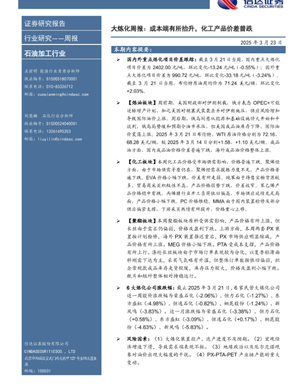 【信达证券】【20250323】大炼化周报:成本端有所抬升,化工产品价差普跌-23页